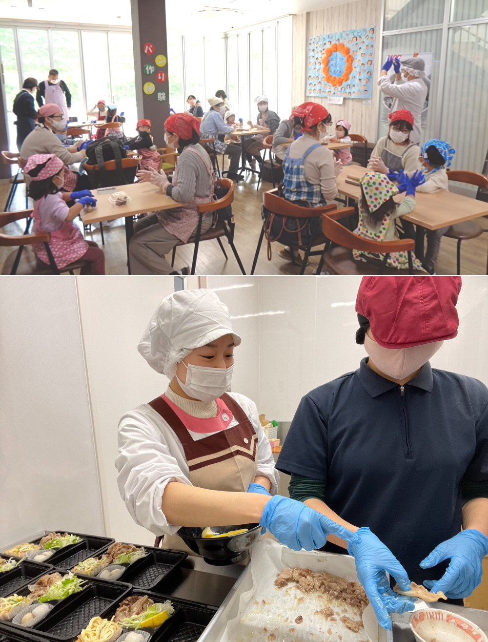 施設利用者さんがお弁当の盛り付けをする補助を行います。